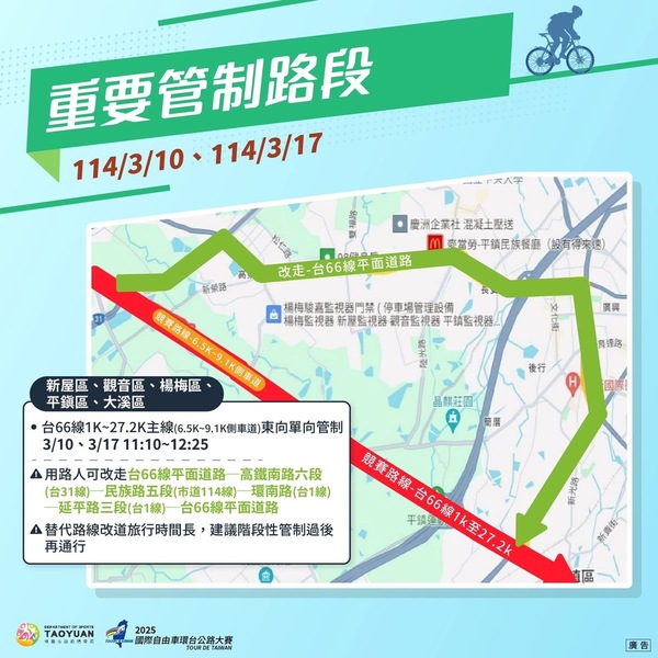 管制時段:3月10日(演練)與3月17日(正式賽)8:00-14:00,台66快速道路往大溪方向實施交通管制。