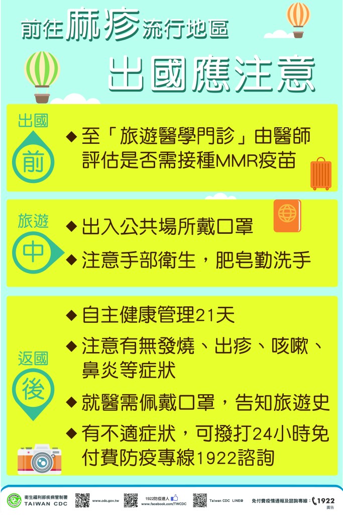 衛生局呼籲應避免帶未滿1歲或未接種「麻疹、腮腺炎、德國麻疹混合疫苗(MMR)」的幼兒至麻疹流行地區;一般民眾(特別是1981年後出生的成人)如計劃前往流行地區,出國前可先至旅遊醫學門診(聯新國際醫院桃園國際機場醫療中心及衛生福利部桃園醫院旅遊醫學科)諮詢評估是否需自費接種MMR疫苗,最重要的是要落實個人衛生防護,勤洗手、避免觸摸口鼻眼睛,出入公共場所時,可佩戴口罩減少病毒傳播機會。如有任何疑問,民眾可撥打市民諮詢服務熱線1999或防疫專線0800-033-355洽詢。