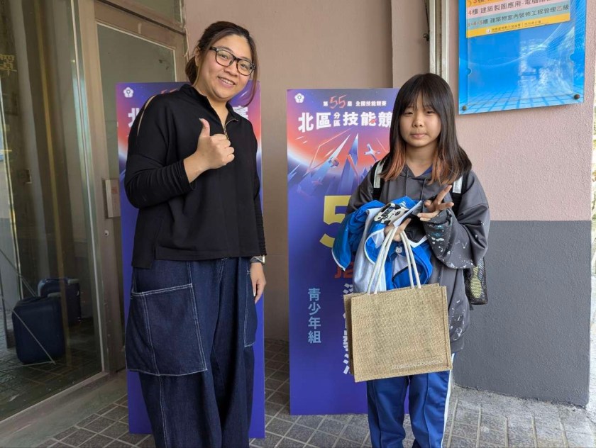 圖說:桃竹苗分署與瑞芳國中共同培訓的漆作職類選手張芷綺(右),在本次青少年組漆作競賽中勇奪金牌,圖左為指導老師宋侑蓁。