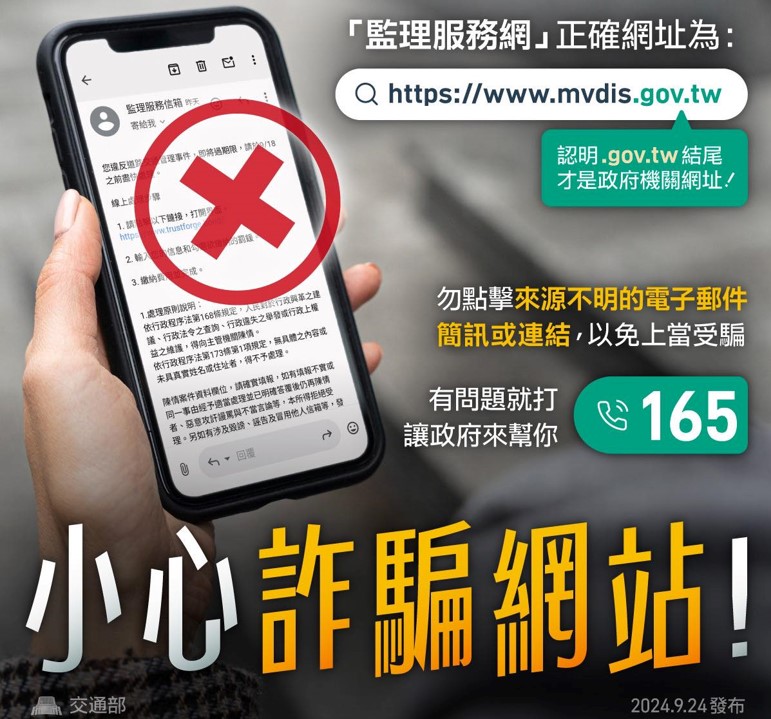 中壢監理站提醒您記得要「停、看、行」,停一下,先別急,查看清楚,再行動,以下提供智慧防範三部曲:首先「認明」:請認明網址為「gov.tw」結尾,簡訊短碼為「111」之號碼,才屬於政府機關。