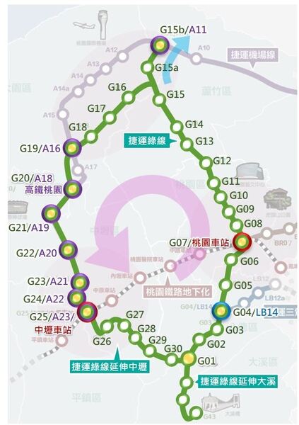 捷運工程局劉慶豐局長表示,G25站將成為未來臺鐵中壢車站、捷運綠線及機場捷運線三鐵共構的核心交通樞紐;G26站緊鄰體育園區,G29站則為市立醫院預定地。整體路線將服務沿線社會住宅、學校、醫療機構及多處聯合開發基地,並與既有機場捷運和捷運綠線無縫連接,形成桃園市內完整的環狀捷運路網,強化桃園、中壢與航空城之間的軌道串聯,有效促進區域社會及經濟發展,桃園已準備好興建第二條自辦捷運。