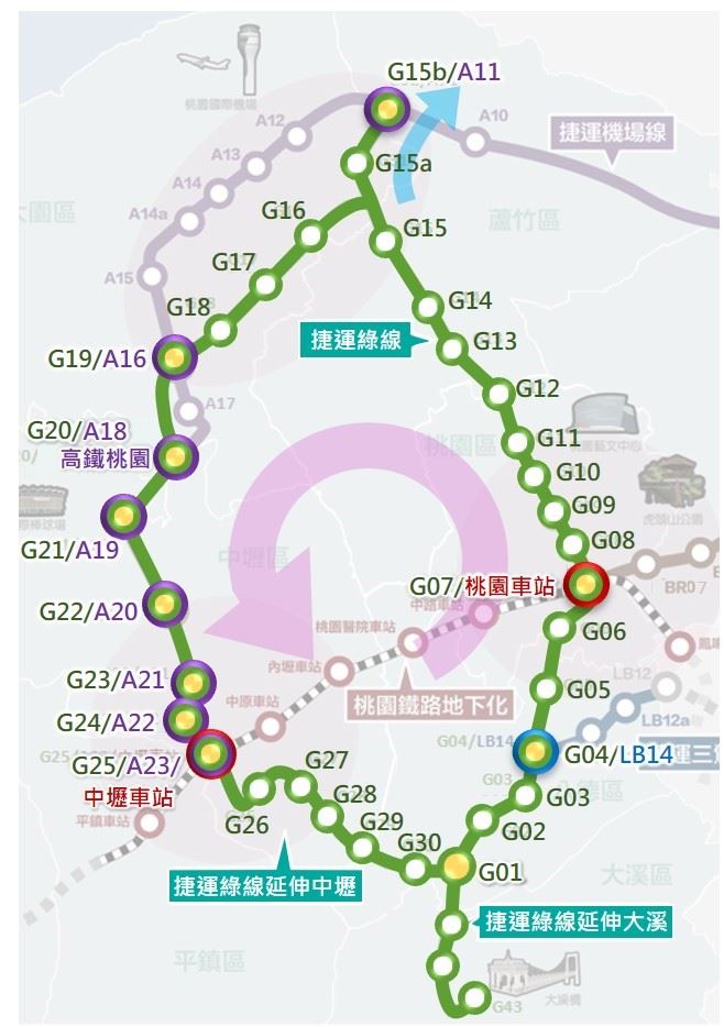 捷運工程局劉慶豐局長表示,G25站將成為未來臺鐵中壢車站、捷運綠線及機場捷運線三鐵共構的核心交通樞紐;G26站緊鄰體育園區,G29站則為市立醫院預定地。整體路線將服務沿線社會住宅、學校、醫療機構及多處聯合開發基地,並與既有機場捷運和捷運綠線無縫連接,形成桃園市內完整的環狀捷運路網,強化桃園、中壢與航空城之間的軌道串聯,有效促進區域社會及經濟發展,桃園已準備好興建第二條自辦捷運。