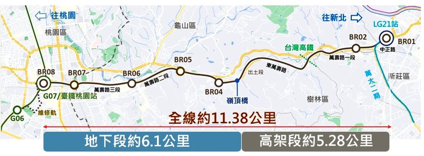 桃園市政府推動捷運棕線計畫穩健前行,全長約11.38公里,設置7座車站(2座高架站與5座地下車站),採高架與地下並行,路線自新北市迴龍地區起,直達桃園市中心,全線未來預估每日運量可達7.6萬人次,尖峰班距可達3.5分鐘,預估最快18分鐘即可自桃園車站直達迴龍,進一步實現「北北桃1小時生活圈」,縮短大台北與桃園之間的通勤距離,並串聯捷運綠線、未來的青線、橘線及銀線等路網,形成便捷轉乘網絡。