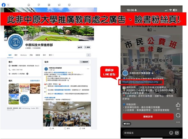 中原大學推廣教育處已於官網明確公告提醒:「親愛的學員您好!提醒您,近期發現有以『中原科技大學進修部』之名義盜用了本校名稱、照片、廣告及網站部分資料,透過臉書廣告邀請加為Line好友,聲稱政府補助課程需要再進一步加客服專員Line好友。鄭重敬告,上述非中原大學推廣教育處之廣告及臉書粉絲頁!提醒您,若已繳交費用給予不明單位,請撥打165反詐騙專線或向警方報案,以確保您的財產安全!」