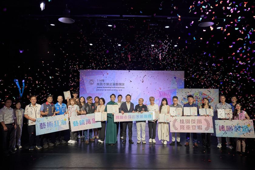 文化局表示,為推動在地演藝團隊蓬勃發展,自民國84年起持續辦理傑出演藝團隊徵選及獎勵計畫,蟬聯113-114兩年文化部特優評鑑肯定。歷經專家學者評選今年共有12個團隊脫穎而出:音樂類涵蓋狂美交響管樂團、金喇叭銅管樂團、風動室內樂團、風雅頌古箏樂團;戲劇類包含何日君再來劇團、沐寧相聲說演坊、犀牛劇團、慢島劇團;舞蹈類有君舞蹈劇場、敦青舞蹈團;傳統戲曲類則由桃興閣掌中劇團、景勝戲劇團等。今(7/16)於米倉劇場舉辦本市傑團授證典禮暨聯合宣傳發布記者會,以「藝鏡萬象 耀眼綻放」為主題,象徵桃園藝文團隊如萬花筒般多元燦爛、表演藝術如鏡面折射般繽紛耀眼,攜手共築一座流動而充滿生命力的城市藝場,期待市民共賞桃園藝文盛事。