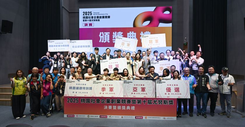 青年事務局表示,2025桃園社會企業創業競賽吸引超過百組團隊報名參賽,經初選與系列專業課程培訓後,共有40組團隊進入決賽,今日頒發社會企業組與社會影響力組前三名、優選及特別獎,其中社會企業組由「台灣生物循環科技股份有限公司」獲得冠軍,社會影響力組則由「女王的呼召」團隊奪冠。