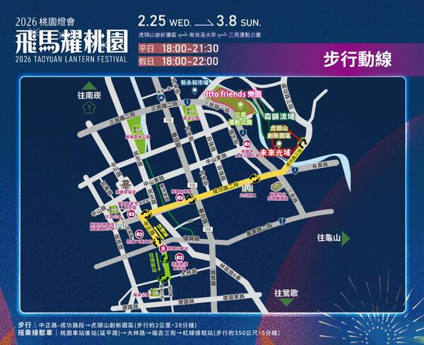 桃園年度視覺盛宴「2026桃園燈會—飛馬耀桃園」,即將於 2 月 25 日至 3 月 8 日閃耀登場!為期 12 天的燈會橫跨「虎頭山創新園區」、「南崁溪水岸」及「三民運動公園」三大場域,分別打造「未來光域」、「森韻流域」與「dtto friends 樂園」。今年不僅有全台首座機械動態飛馬主燈,更導入遊樂園等級的巡遊展演與科技互動,邀請民眾共赴這場光影嘉年華。