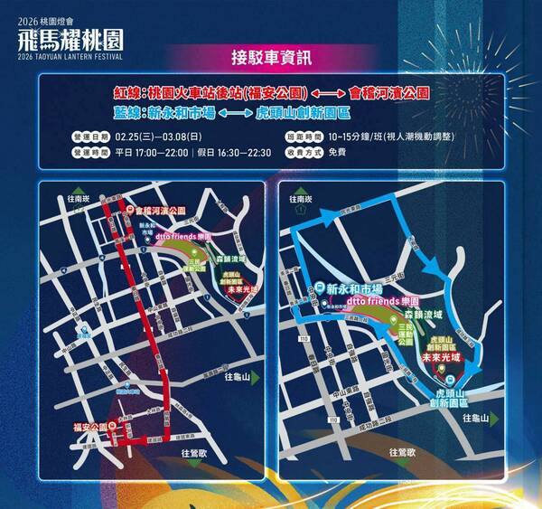 交通局指出,燈會管制區內禁止車輛進入及停放,周邊將加強拖吊取締。開車民眾建議停放新永和市場停車場;騎機車可至青溪公園、桃園高中(假日)及退輔會職訓中心(假日)臨時停車區。為方便民眾賞燈,市府提供2條免費接駁專車:紅線往返「桃園火車站後站-會稽河濱公園」,藍線往返「新永和市場-虎頭山新創園區」,並將依人潮彈性增班,建議優先搭乘大眾運輸前往。