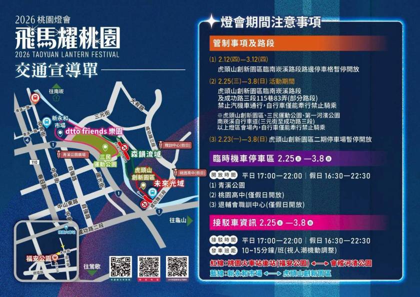 自115年2月25日至3月8日止「2026桃園燈會」於虎頭山創新園區、南崁溪水岸及三民運動公園盛大登場,為因應桃園燈會湧入的大量人潮及車流,將於活動會場周邊道路執行交通管制,並加強疏運措施以紓解人流及車流,維護交通順暢。