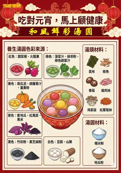 湯底則可選用昆布與柴魚熬煮天然鮮味基底,加入香菇、鴻喜菇及紅蘿蔔絲提味,減少鹽分與調味料使用,同樣能呈現清爽順口的風味。節慶美味不必犧牲健康,只要掌握「適量攝取、均衡搭配」原則,民眾仍能在團圓時刻安心品嚐元宵美味,健康過節。