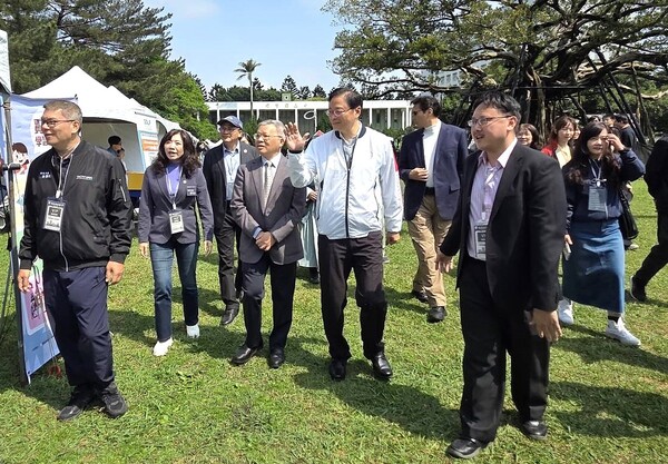 桃園市長張善政在中央大學蕭述三校長的陪同下,參觀2026中央大學企業博覽會展場攤位。