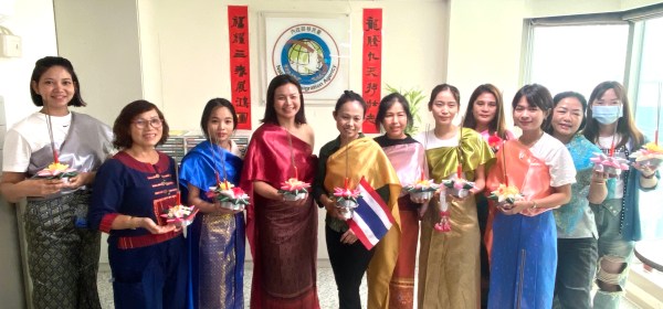 新住民學員手持DIY水燈,並穿著泰國傳統服飾一同合