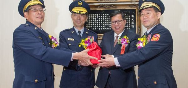 桃園市長鄭文燦(13)日上午前往市府警察局2樓大禮