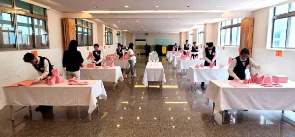 術科競賽考題為「長檯布鋪換」及「口布摺疊題組」。