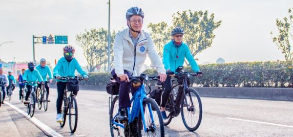 張市長騎單車陪同小騎士出發。 桃園市長張善政9日上