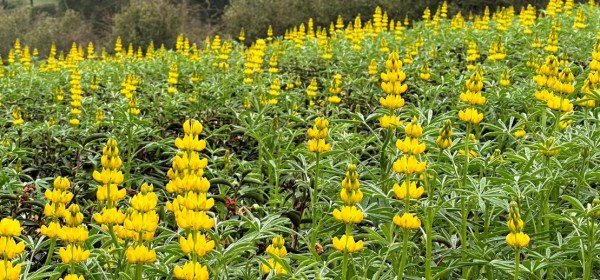 近日桃園龍潭大北坑休閒農業區的金黃色魯冰花開始綻放