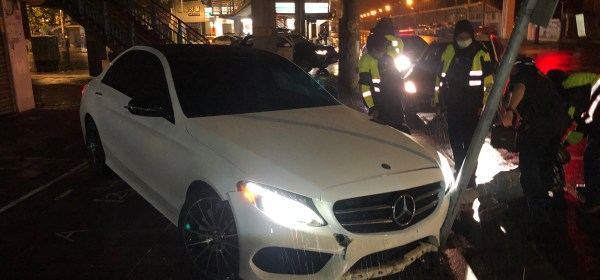 攔查不停無照酒駕男自撞路邊護欄。 白色自小客今14