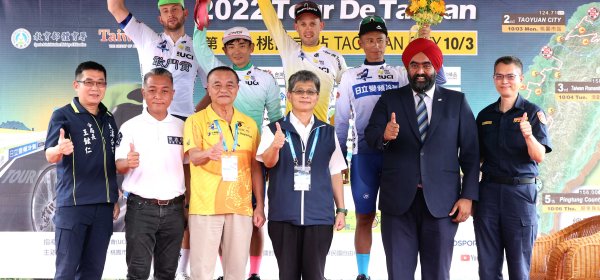 桃園站四位冠軍衫得主與親臨角板山頒獎的貴賓合影。