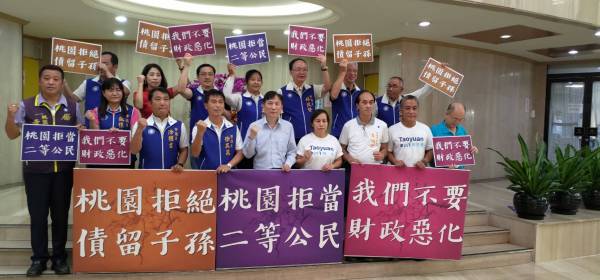 在「桃園不要財政惡化」、「桃園拒當二等公民」、「桃