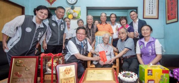 桃園市長鄭文燦19日上午前往大溪區,為百歲人瑞藍王