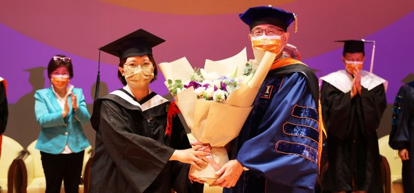 中央大學畢聯會會長、客家系四年級廖宇萱(左)獻花給
