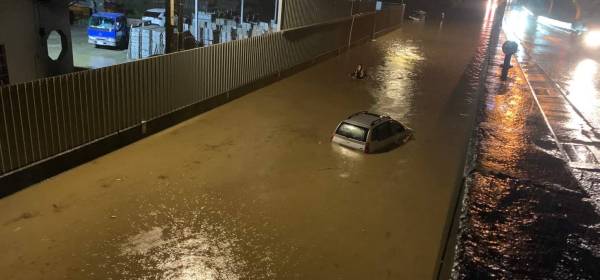 連日大雨造成桃園市觀音地區部分道路積水,導致路過的