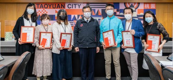 市長與6名績優研考人員合影 桃園市長鄭文燦13日上