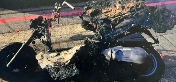 疑似機車倒地漏油,零件又摩擦產生火花,引起燃燒,騎