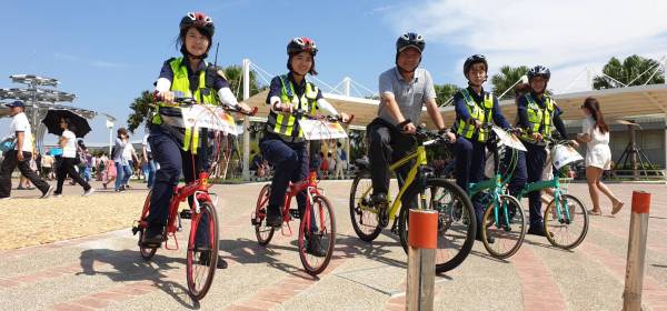 楊梅分局長林信雄(中)與農業博覽會腳踏車巡邏隊女警